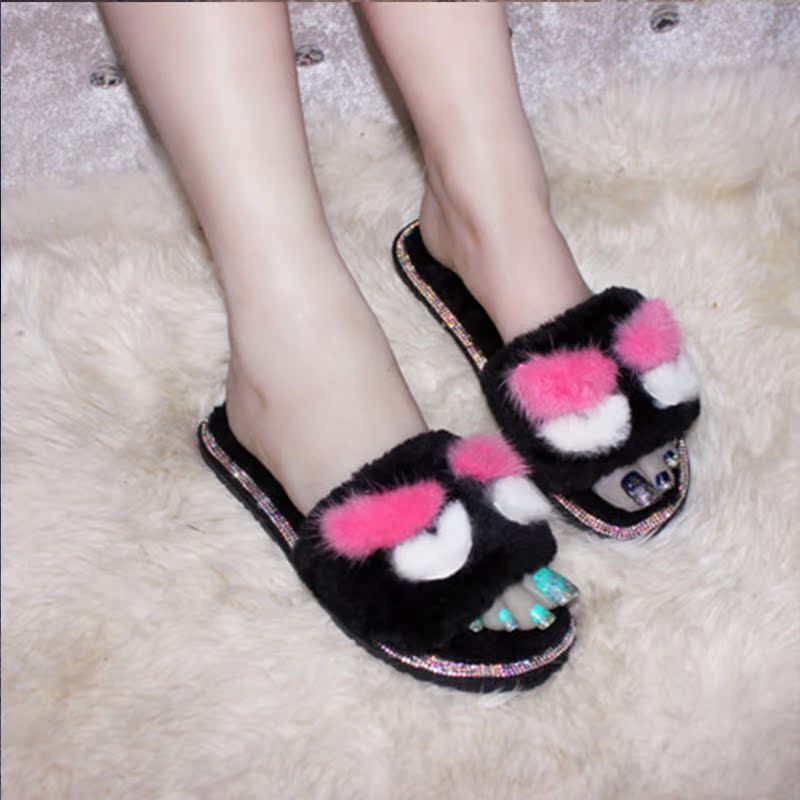 妖狐族原创设计拖鞋2019新款毛绒一字小怪兽眼睛水钻鱼嘴室内拖鞋热门设计联盟服务商